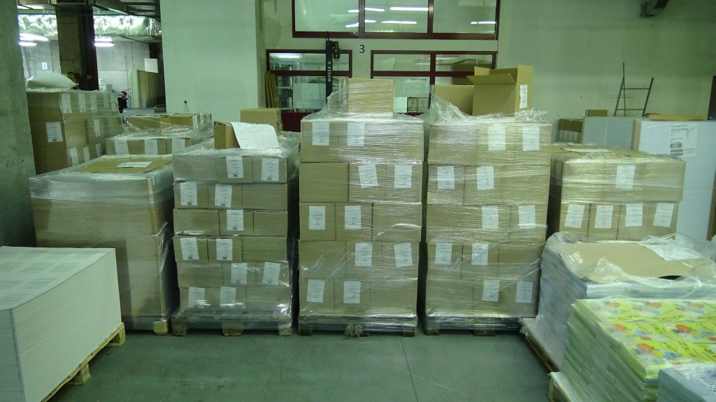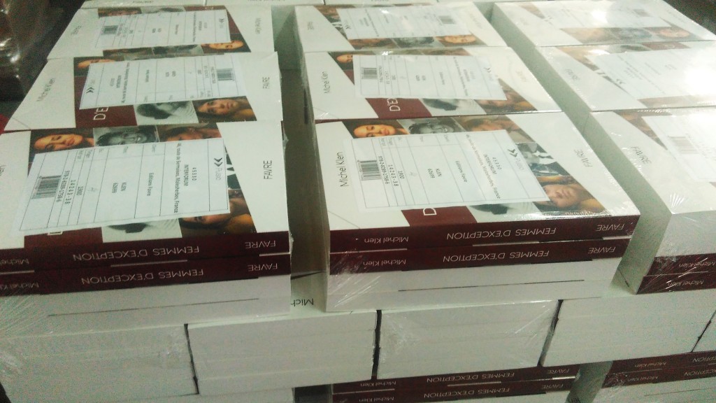 En premier lieu nous plaçons un carton protecteur sur la palette. Ensuite nous empilons les paquets ou les cartons. Quand les livres sont dans les paquets: