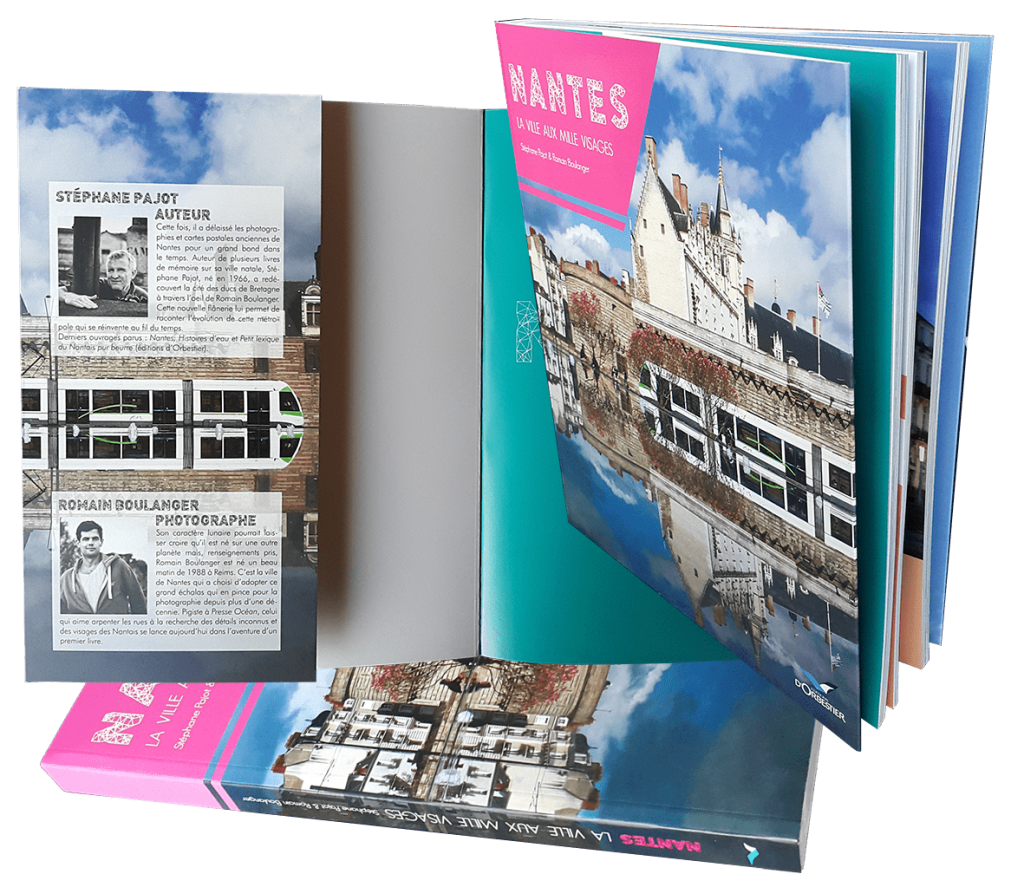 Les dimensions du livre « Nantes la ville aux mille visages » sont remarquables. Le format 240 x 300 mm (format non disponible sur tablette…) est choisi pour valoriser le contenu du livre et pour permettre au lecteur d’admirer pleinement les belles images qui caractérisent cet ouvrage exclusif. Le façonnage cousu-collé et le papier de l’intérieur robuste (couché 150 g/m2) permettent l’ouverture multiple et fréquente – une demande inévitable pour un ouvrage de ce genre – un beau livre avec un léger penchant encyclopédique. Ceci résulte en un poids supérieur à 1,3 kg qui ne pose pas de problèmes de manipulation, car vu la taille importante, le livre n’est évidemment pas conçu pour être tenu dans un sac à main.